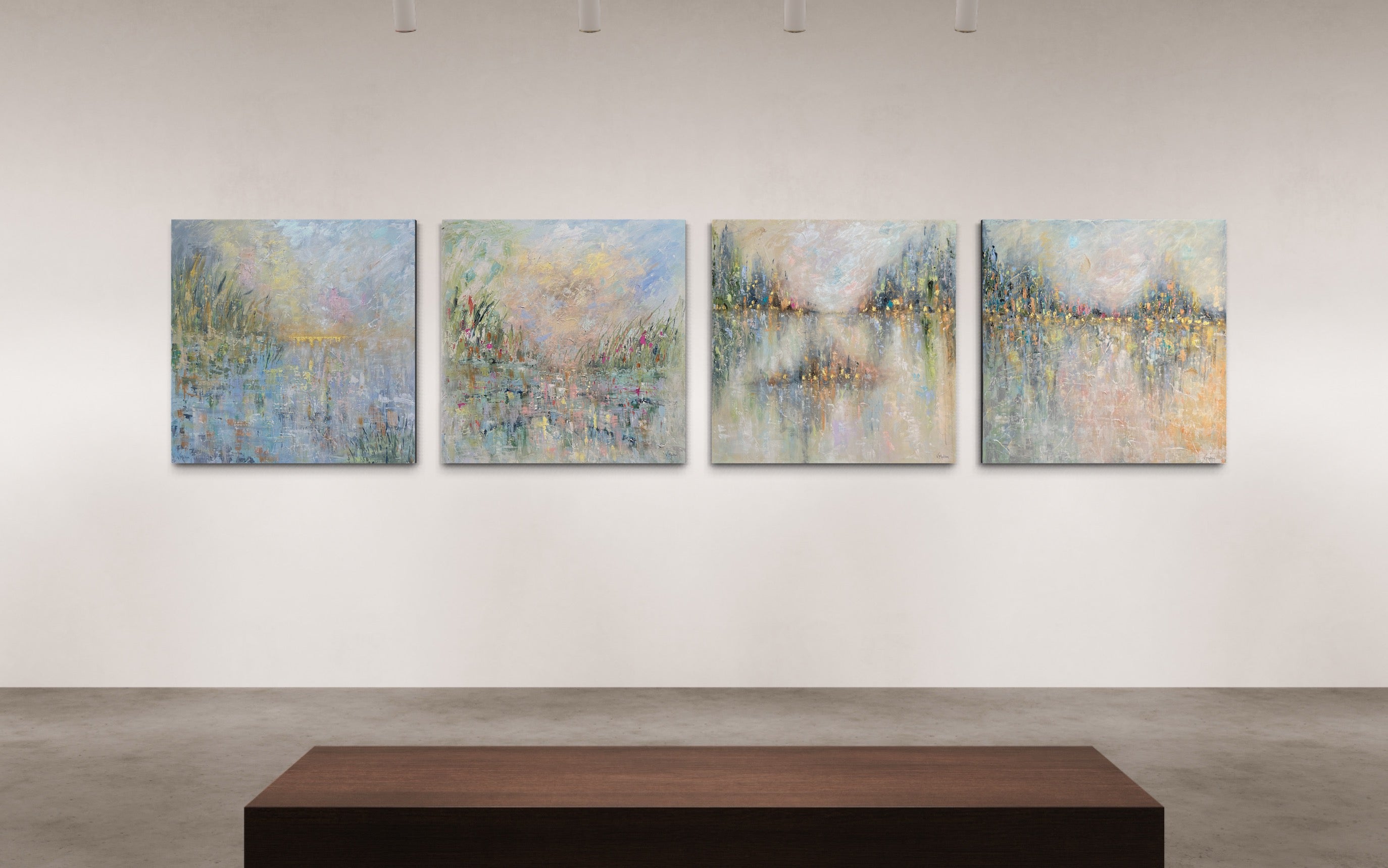 Discover peaceful abstract landscape paintings featuring genuine gold leaf accents