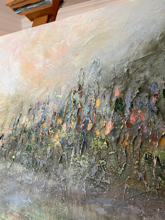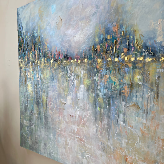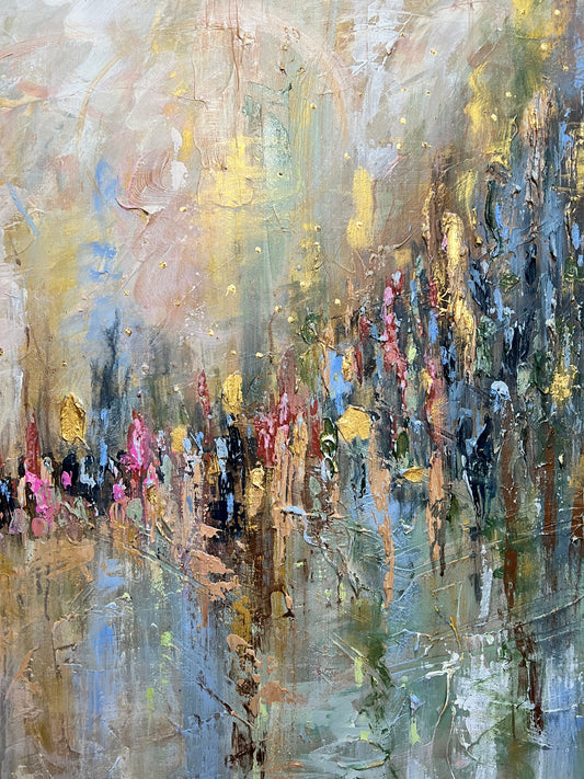 Abstract and impressionistic landscape paintings featuring layered acrylics, rich textures, and 24K gold leaf, evoking a sense of calm, peace, and joy.
