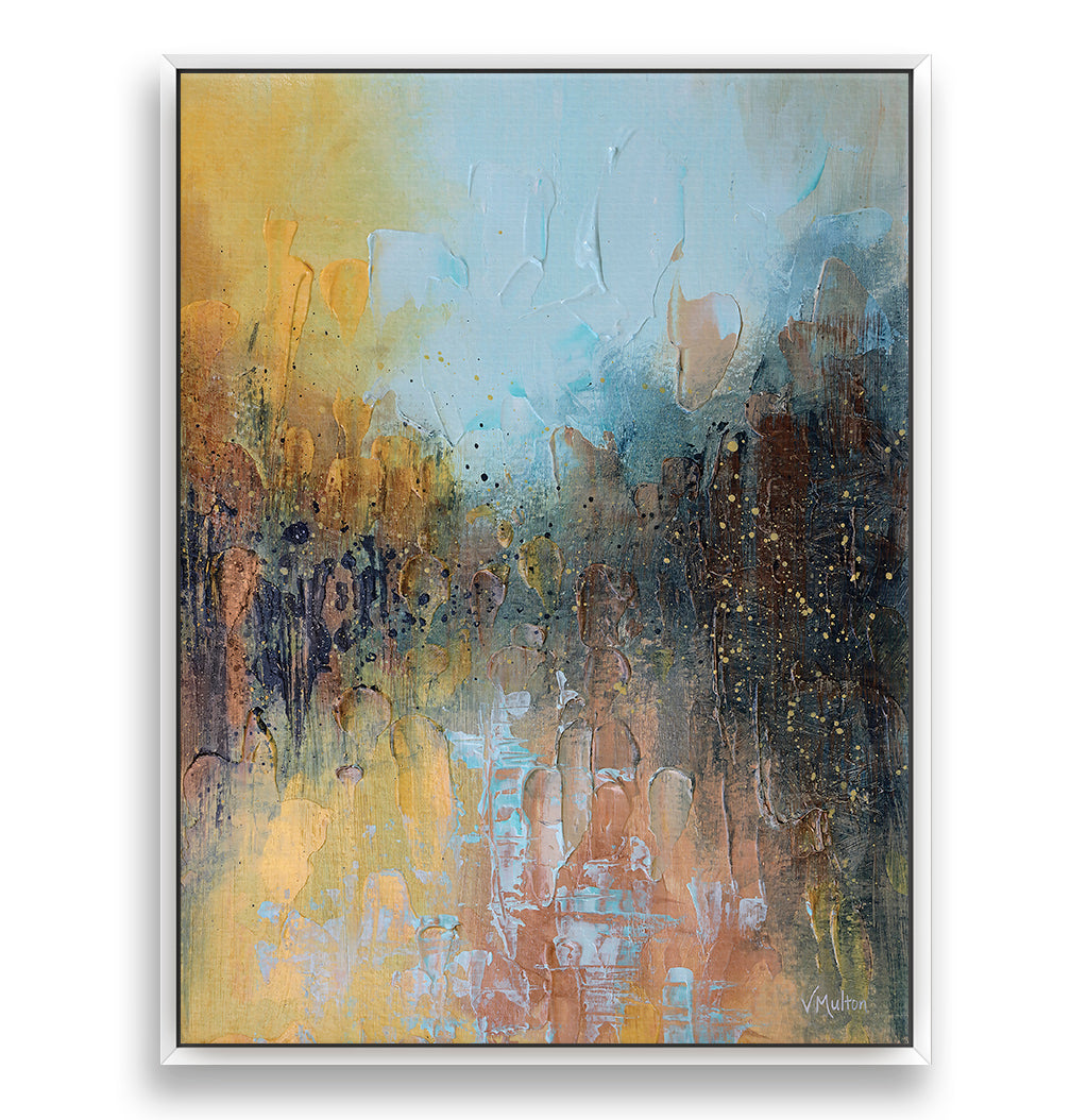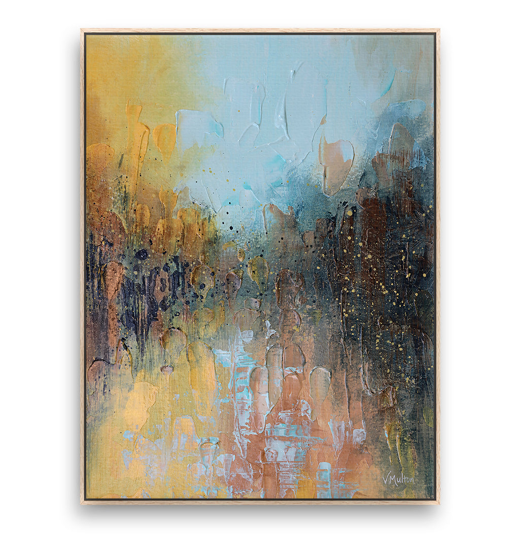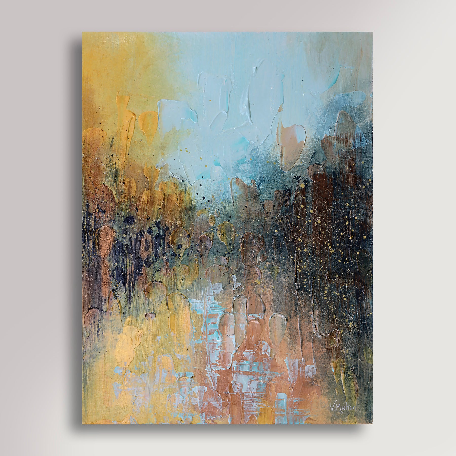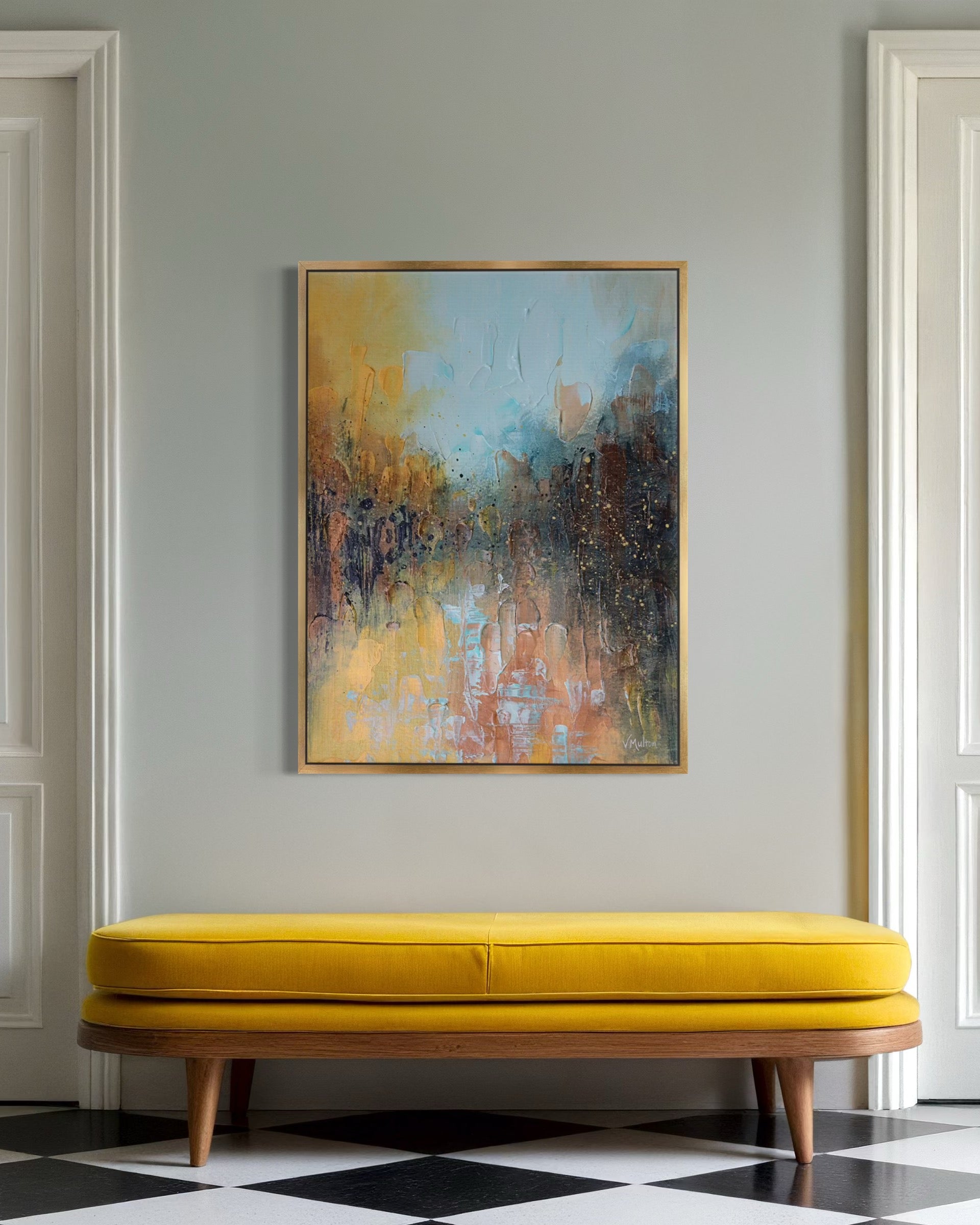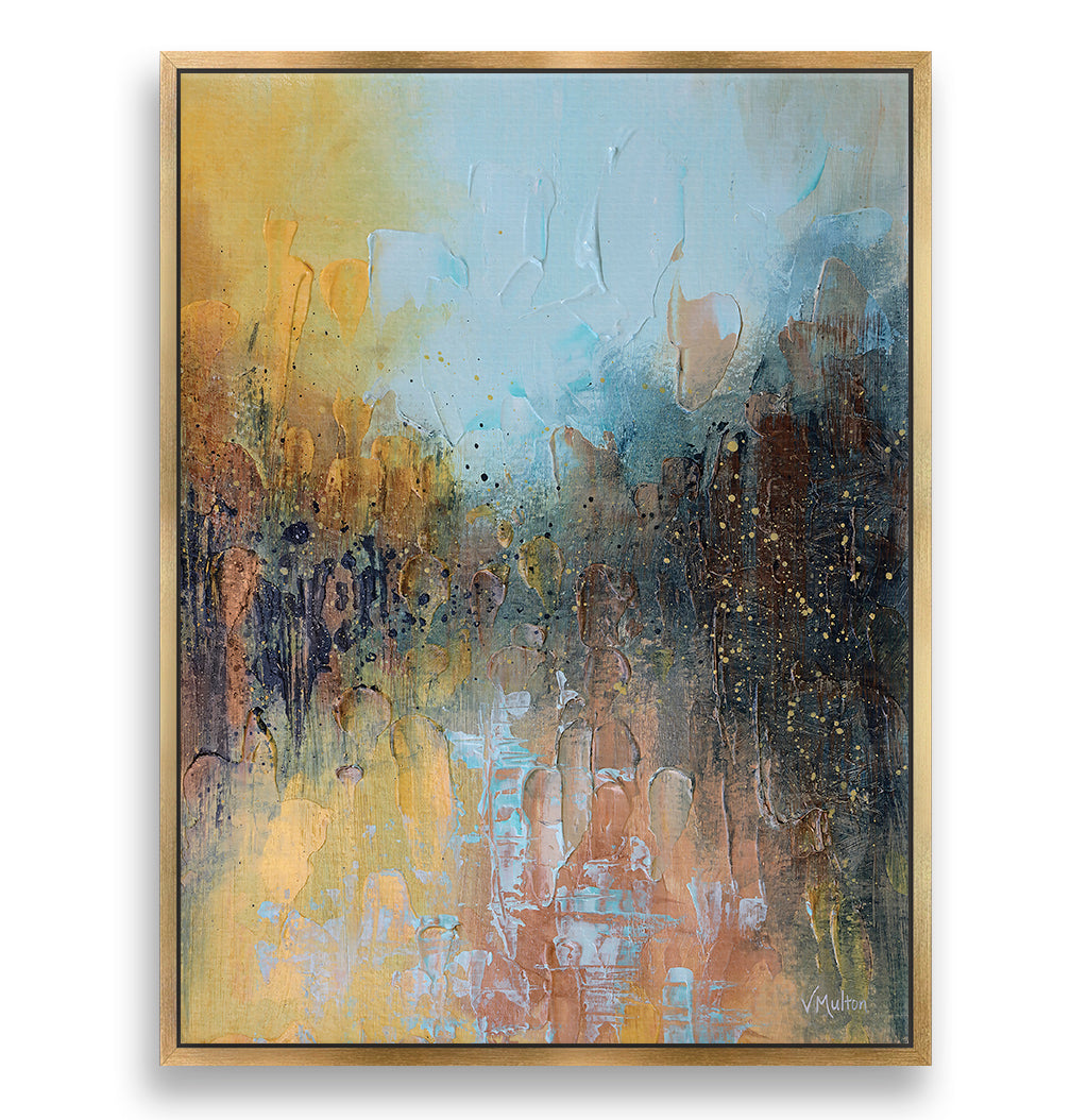 Bring warmth and vibrancy into your home with “Bathed in Sunlight,” an expressive abstract landscape giclée canvas print. Sweeping strokes of light blue, golden yellow, and bronze capture the glow of sunlight on the horizon, blending energy and tranquility in a captivating composition.