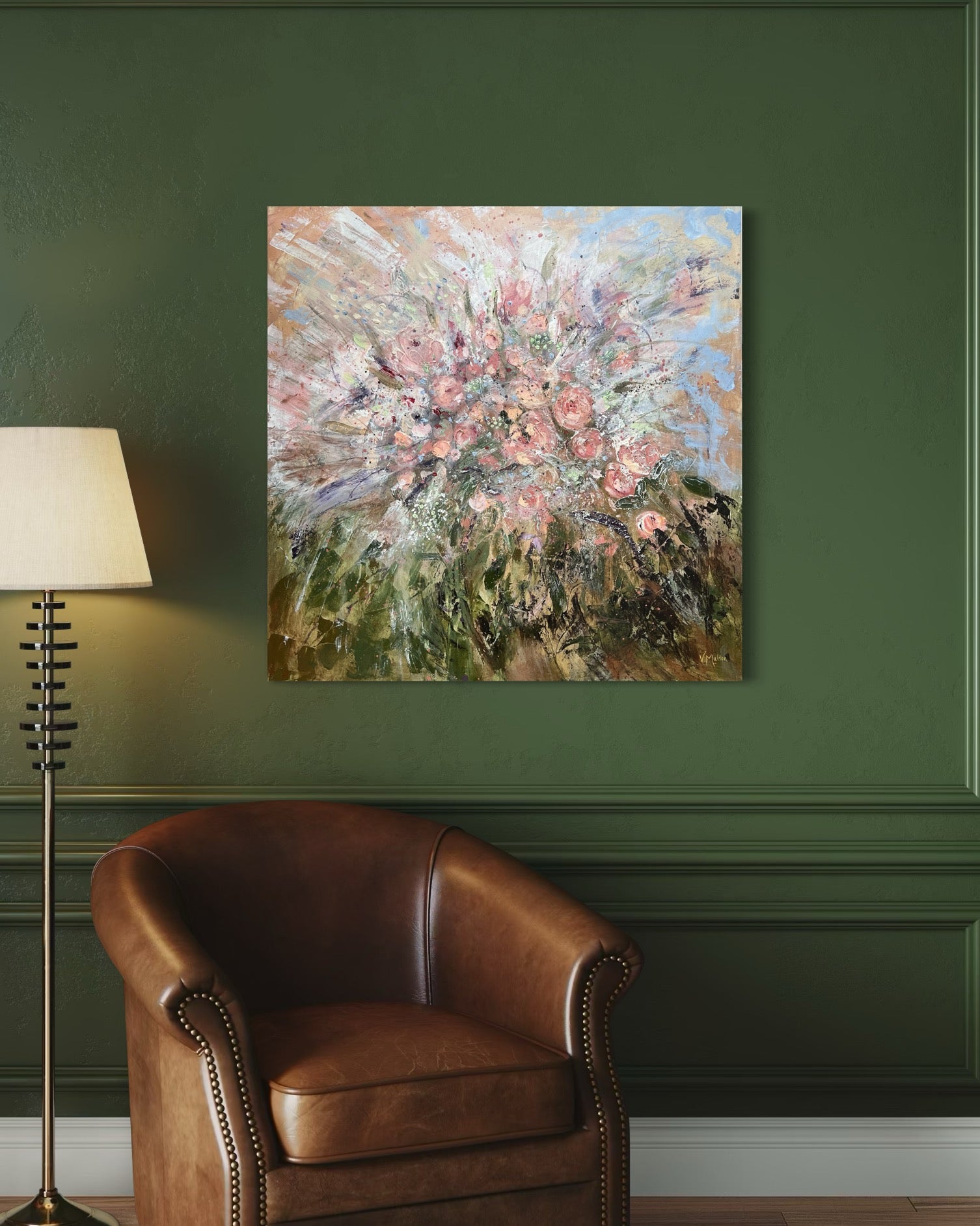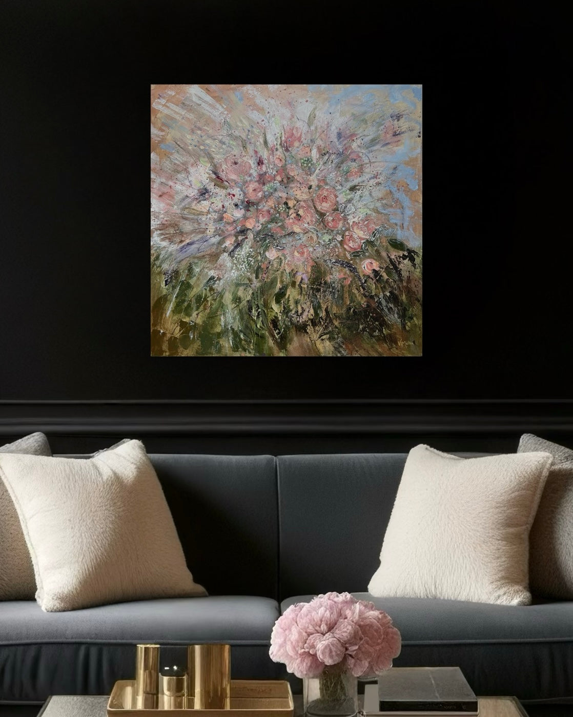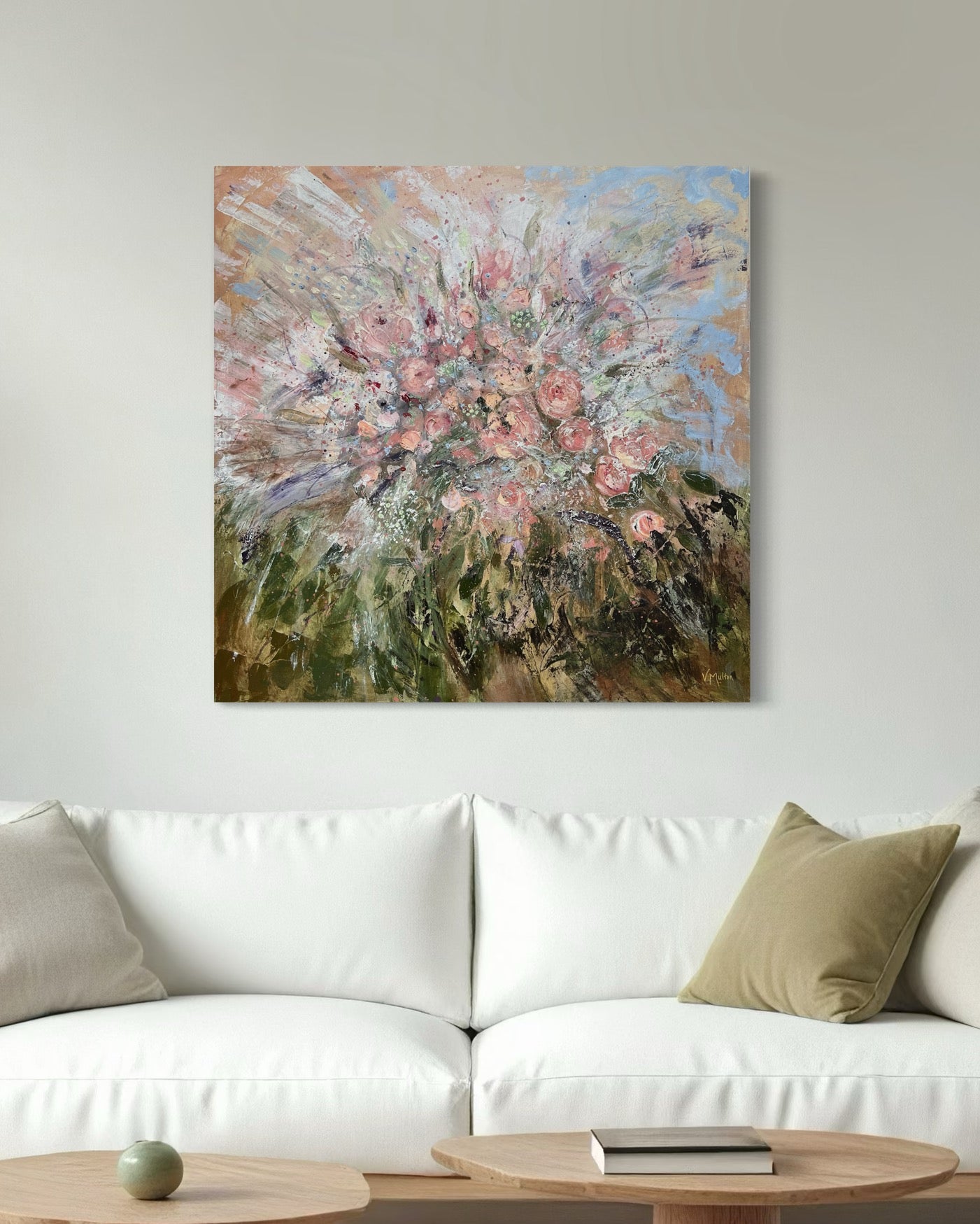 This expressive abstract floral painting bursts with pinks, blues, beige, purple, and deep greens, creating a dynamic yet soothing composition. Layers of rich texture, applied with a blend of bold brushstrokes and palette knife techniques, bring depth and movement to the canvas. The interplay of colors and forms evokes the beauty of a blooming bouquet, making this piece a perfect statement for both traditional and contemporary interiors. Ideal for art collectors and home decorators seeking textured floral wall art, this unique artwork adds elegance and energy to any space.