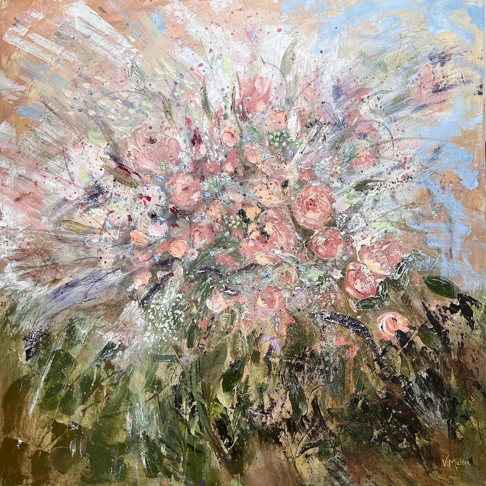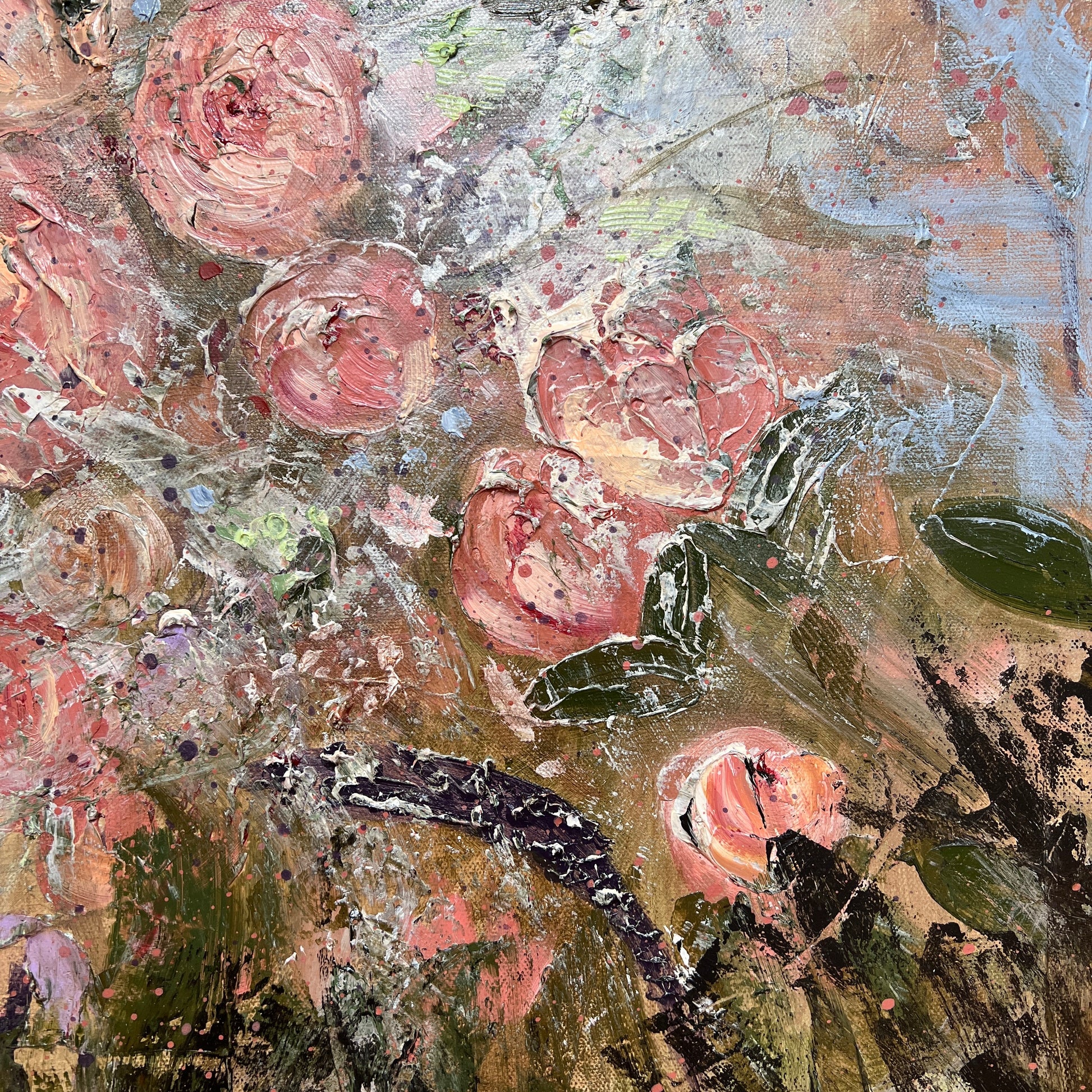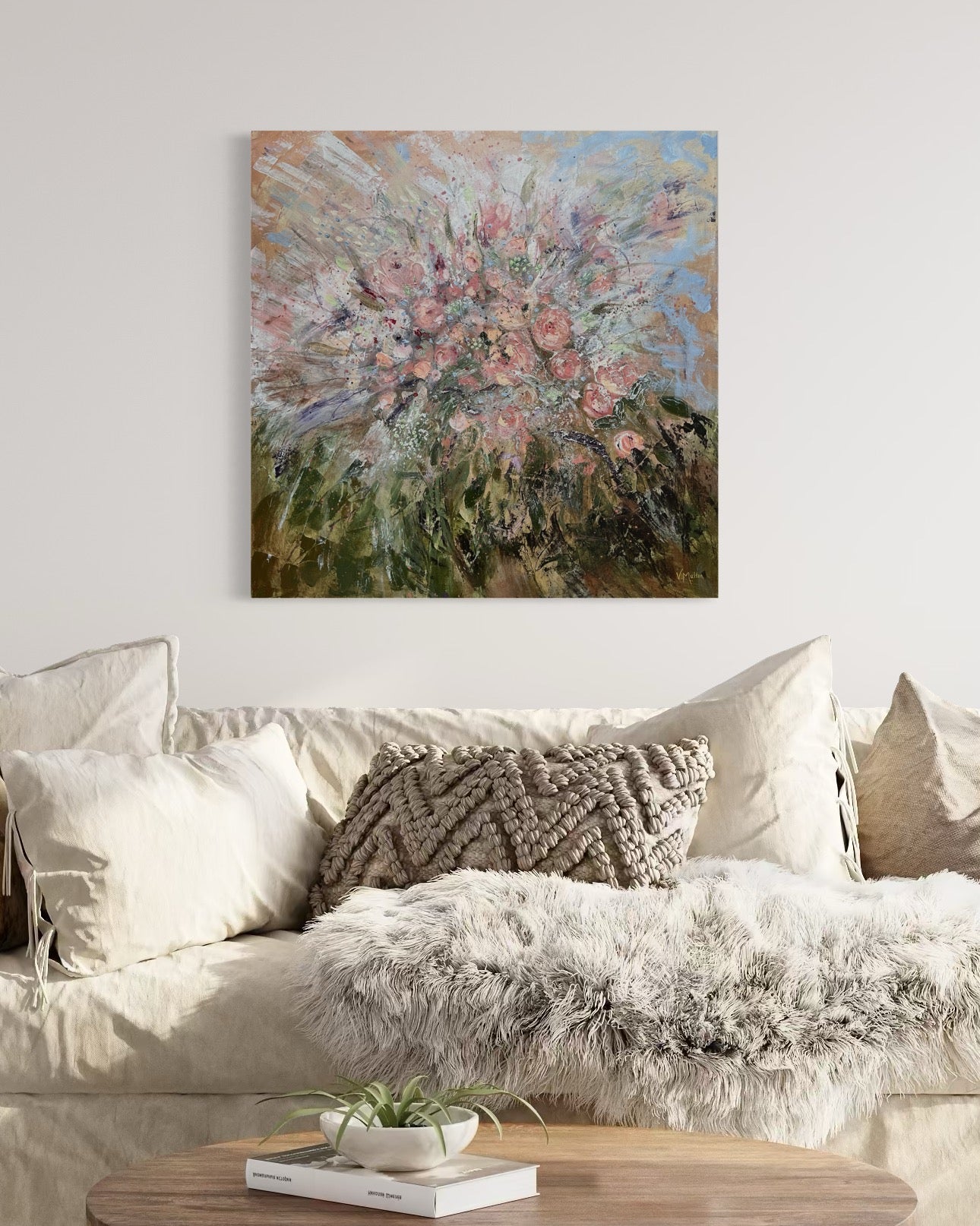 This expressive abstract floral painting bursts with pinks, blues, beige, purple, and deep greens, creating a dynamic yet soothing composition. Layers of rich texture, applied with a blend of bold brushstrokes and palette knife techniques, bring depth and movement to the canvas. The interplay of colors and forms evokes the beauty of a blooming bouquet, making this piece a perfect statement for both traditional and contemporary interiors. Ideal for art collectors and home decorators seeking textured floral wall art, this unique artwork adds elegance and energy to any space.