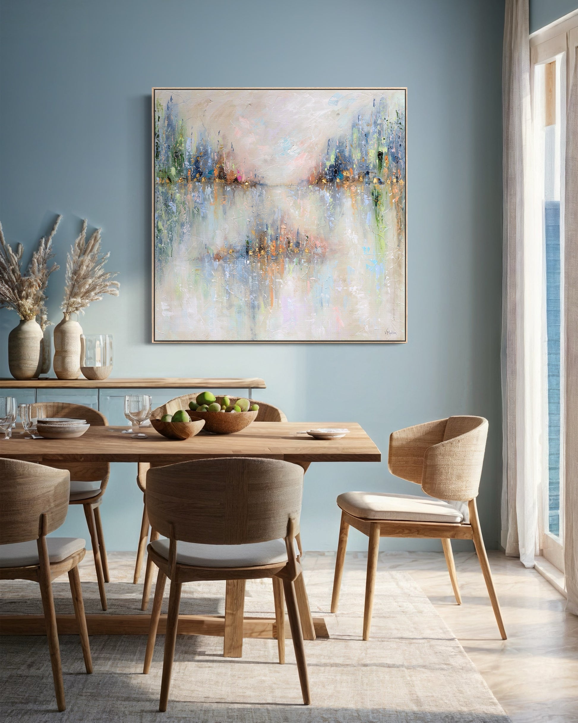 Create a serene focal point with “Ethereal Radiance,” a calming abstract landscape giclée canvas print. Soft blues, greens, and touches of gold flow together in a dreamy palette that inspires peaceful reflection and adds a tranquil glow to modern interiors.