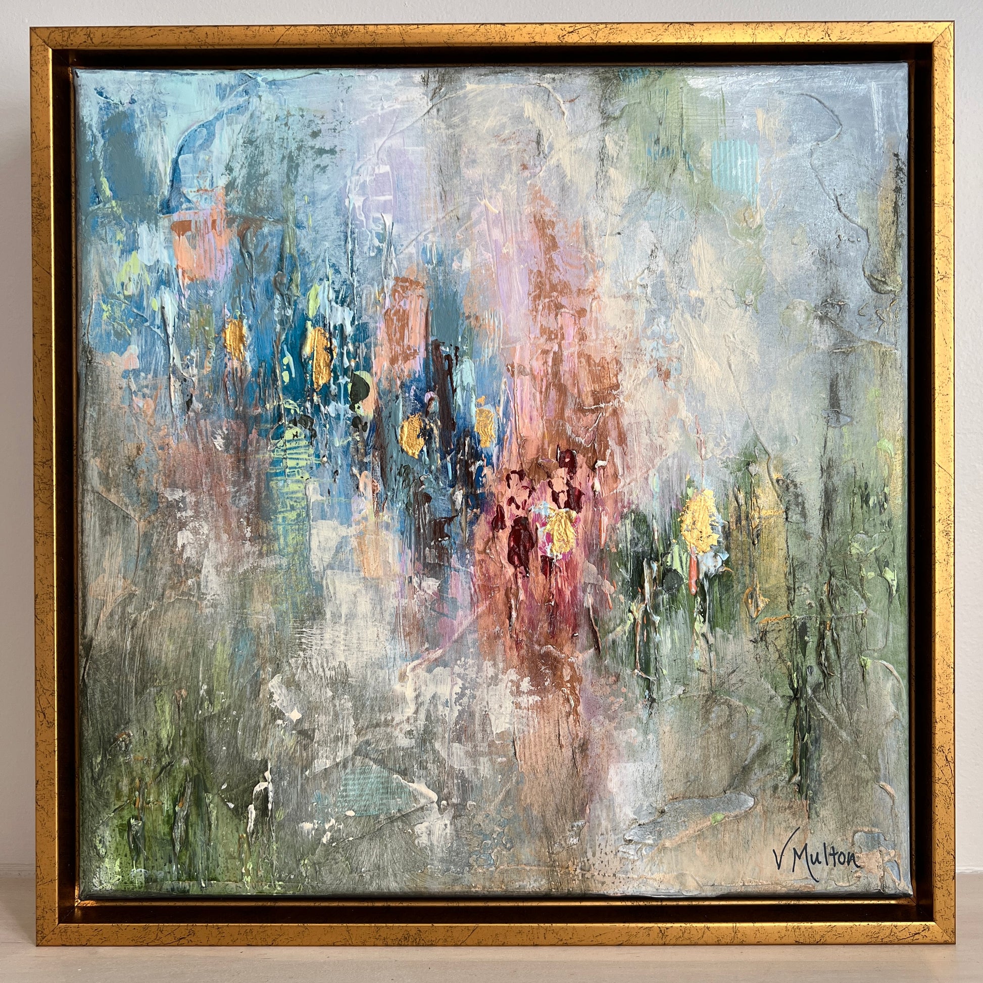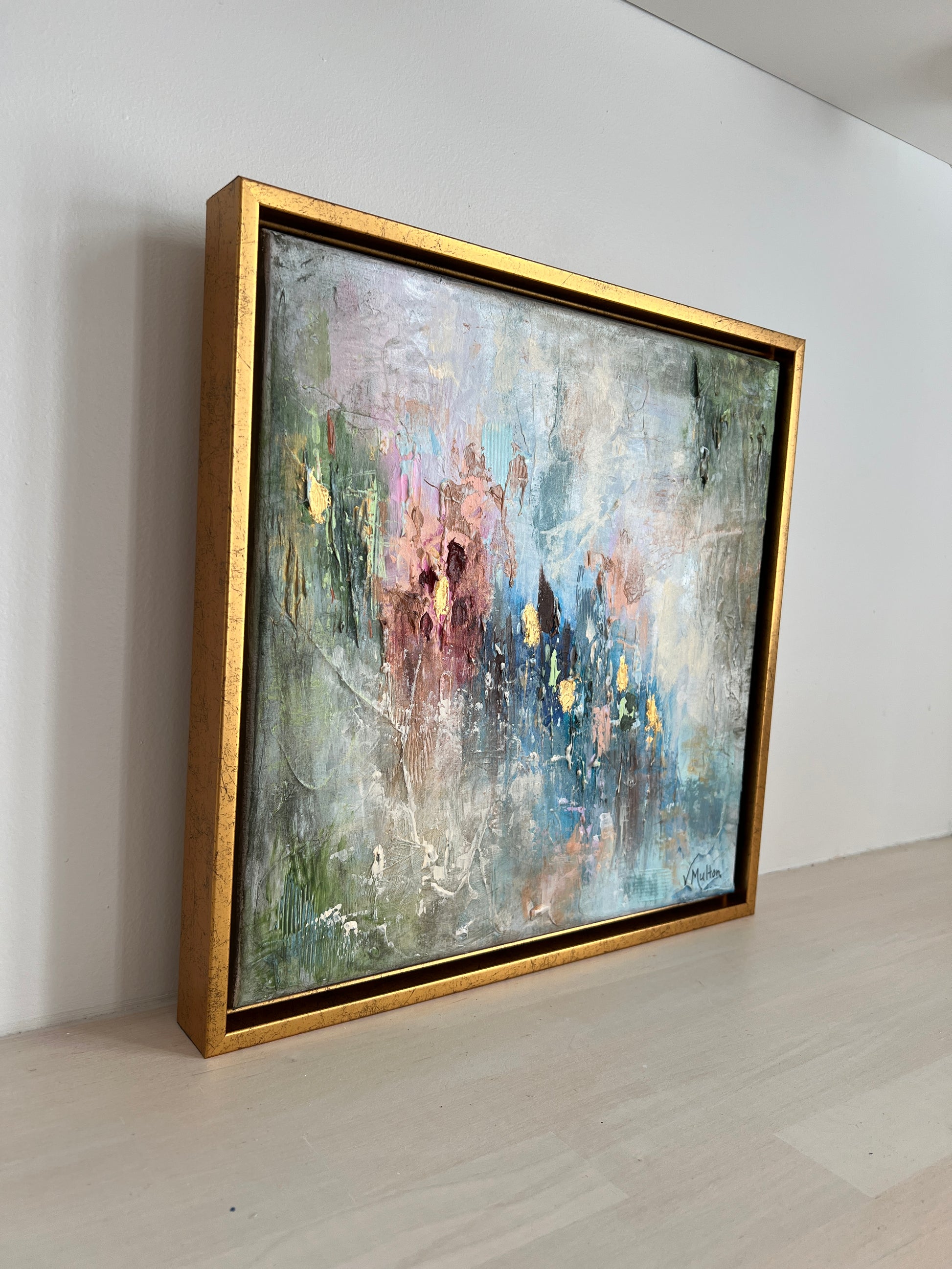This painting has a nice texture that was created with a combination of brushstrokes and a palette knife. It shimmers with touches of 24K gold leaf and iridescent paint. The painting is on a gallery-wrapped canvas. It comes in a gold floater frame and has been strung with wire, ready to hang.