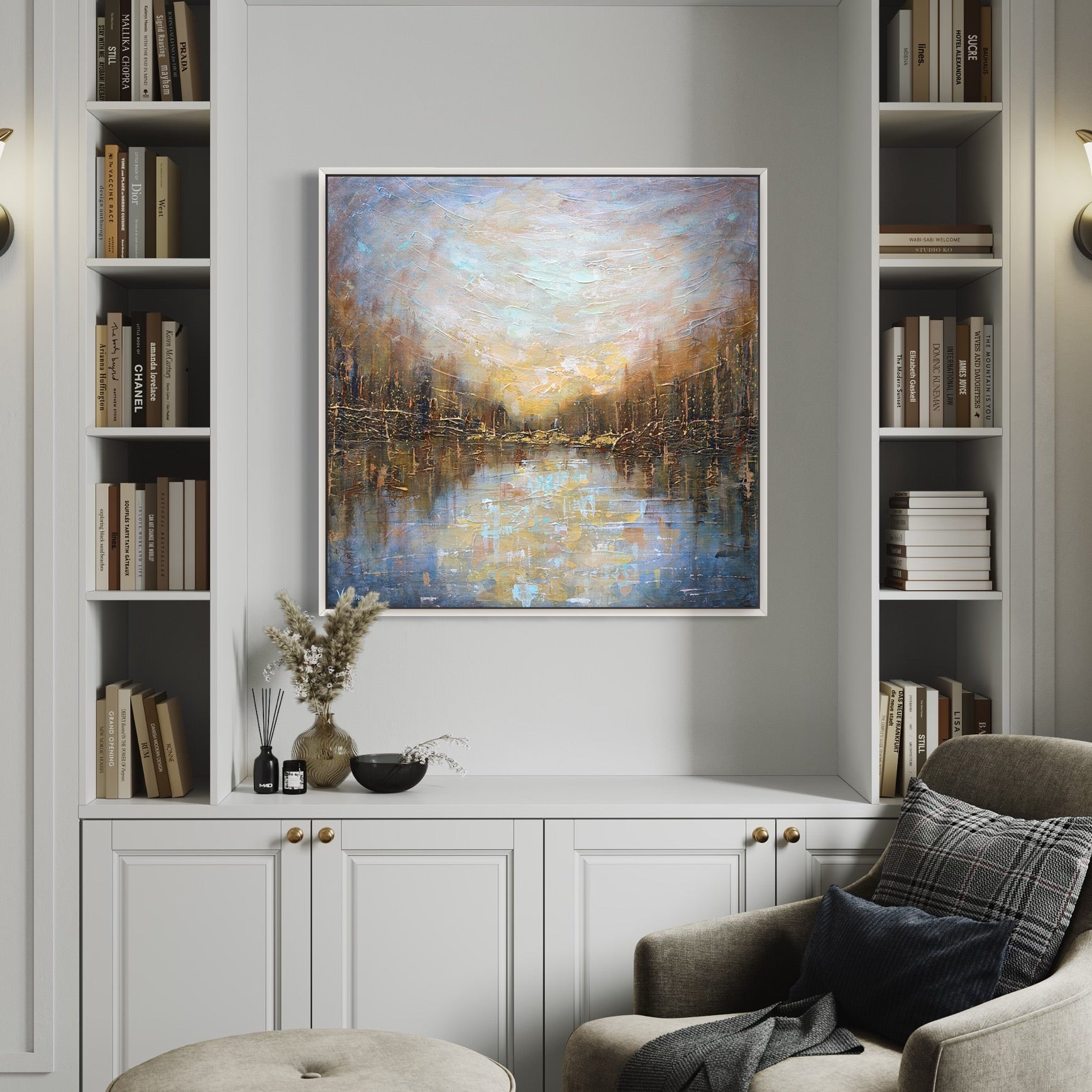 Bring warmth and inspiration to your space with “Hope in the Distance,” an abstract landscape giclée canvas print. Golden hues blend with calm blues like a sunset sky, while earthy browns and grays add depth. Bright touches of yellow symbolize resilience and optimism, reminding us to keep looking forward.