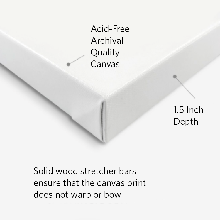 - Gallery-wrapped canvas, 1.5” deep, white sides on unframed canvases, mirror-wrapped sides on framed canvases, wired and ready to hang.