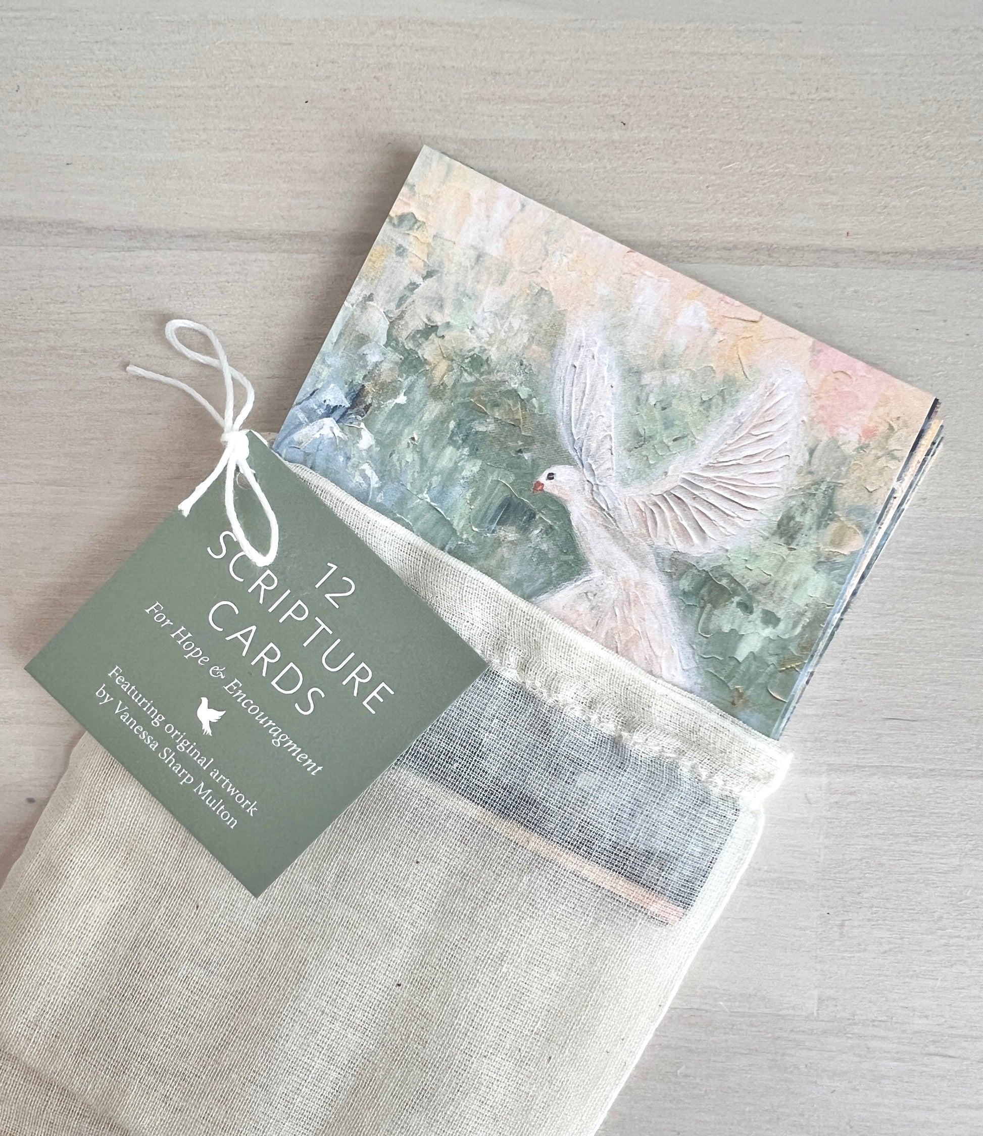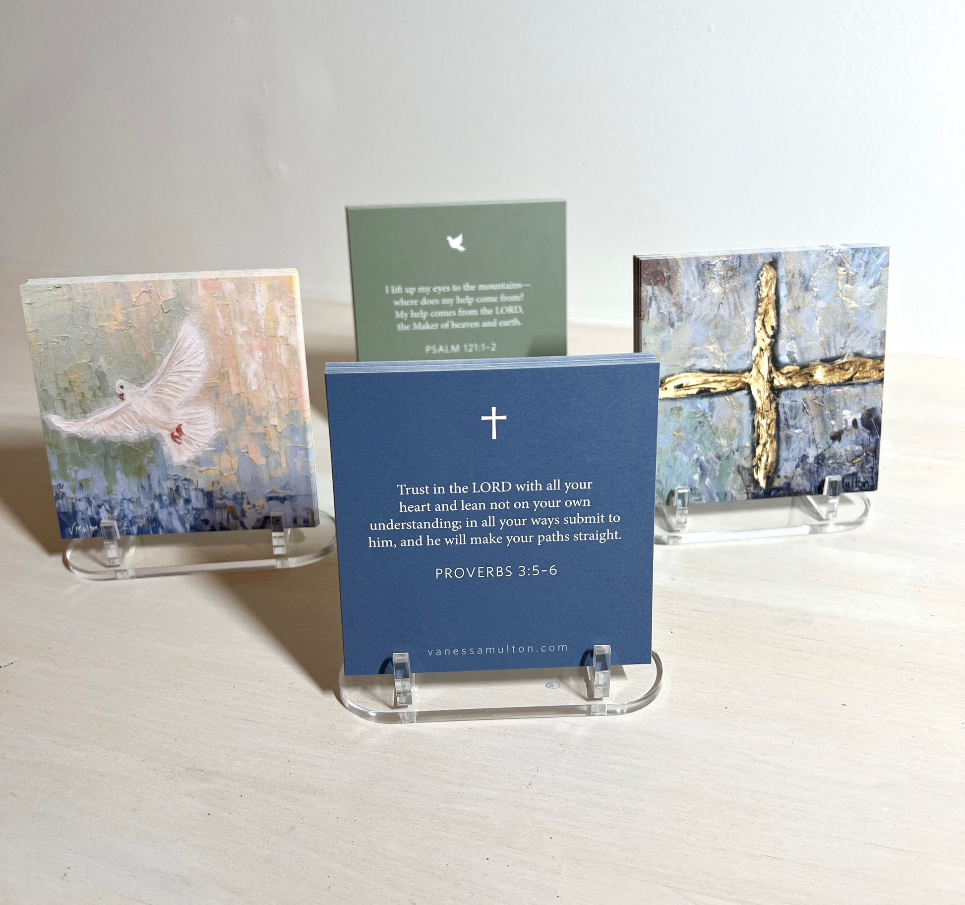 Each 3.5 x 3.5 inch card includes artwork from Vanessa’s original dove or cross paintings paired with uplifting scripture to offer encouragement and hope.