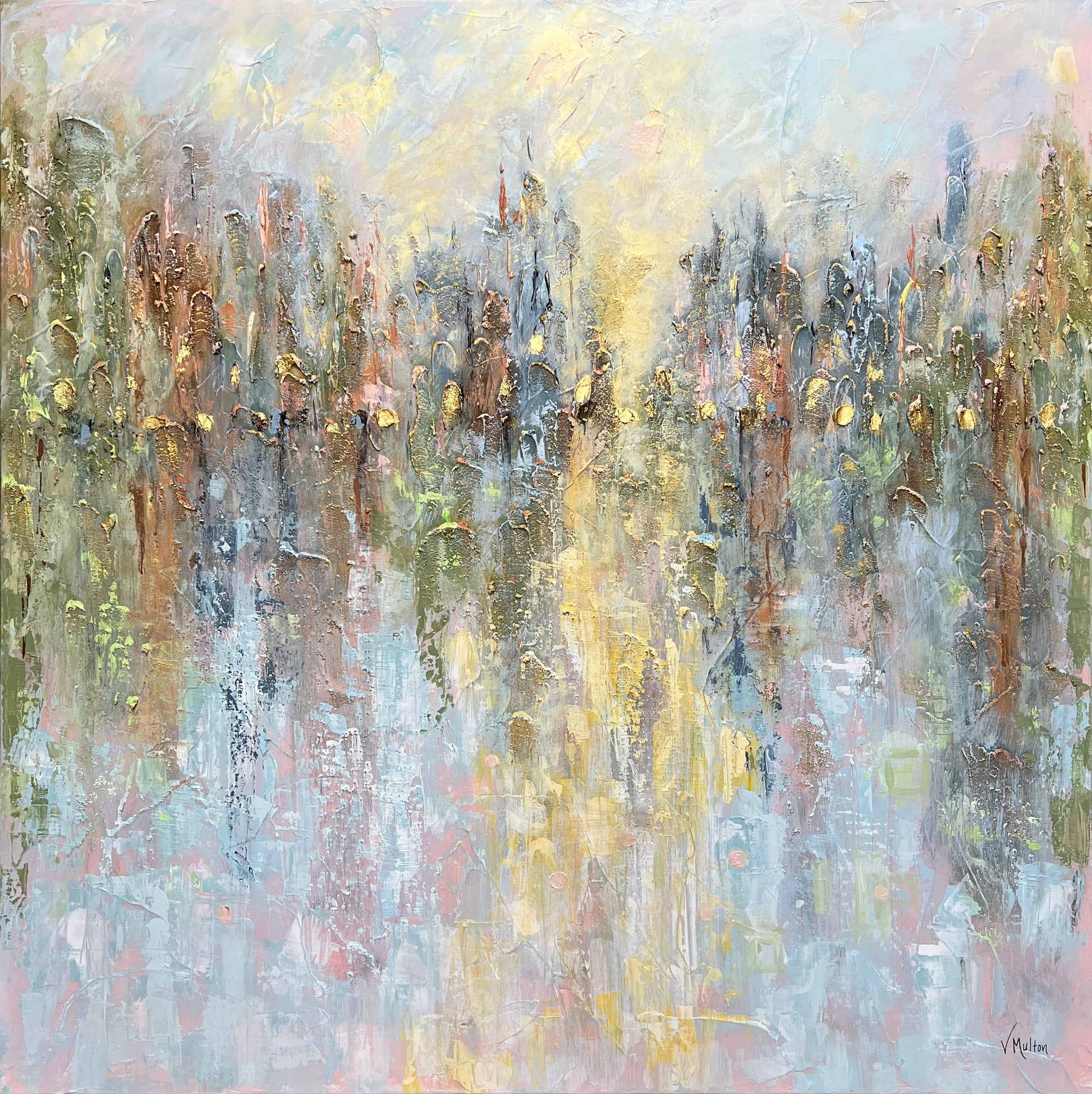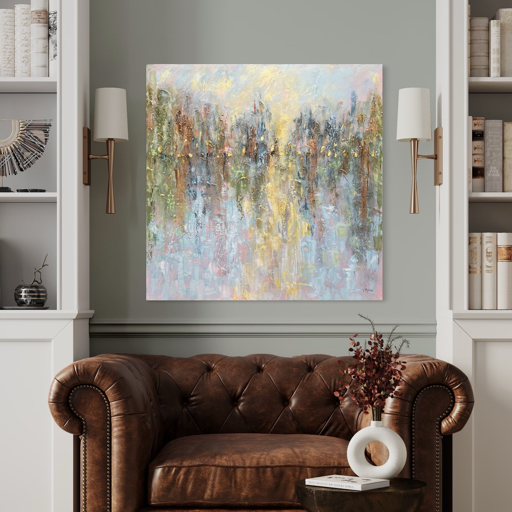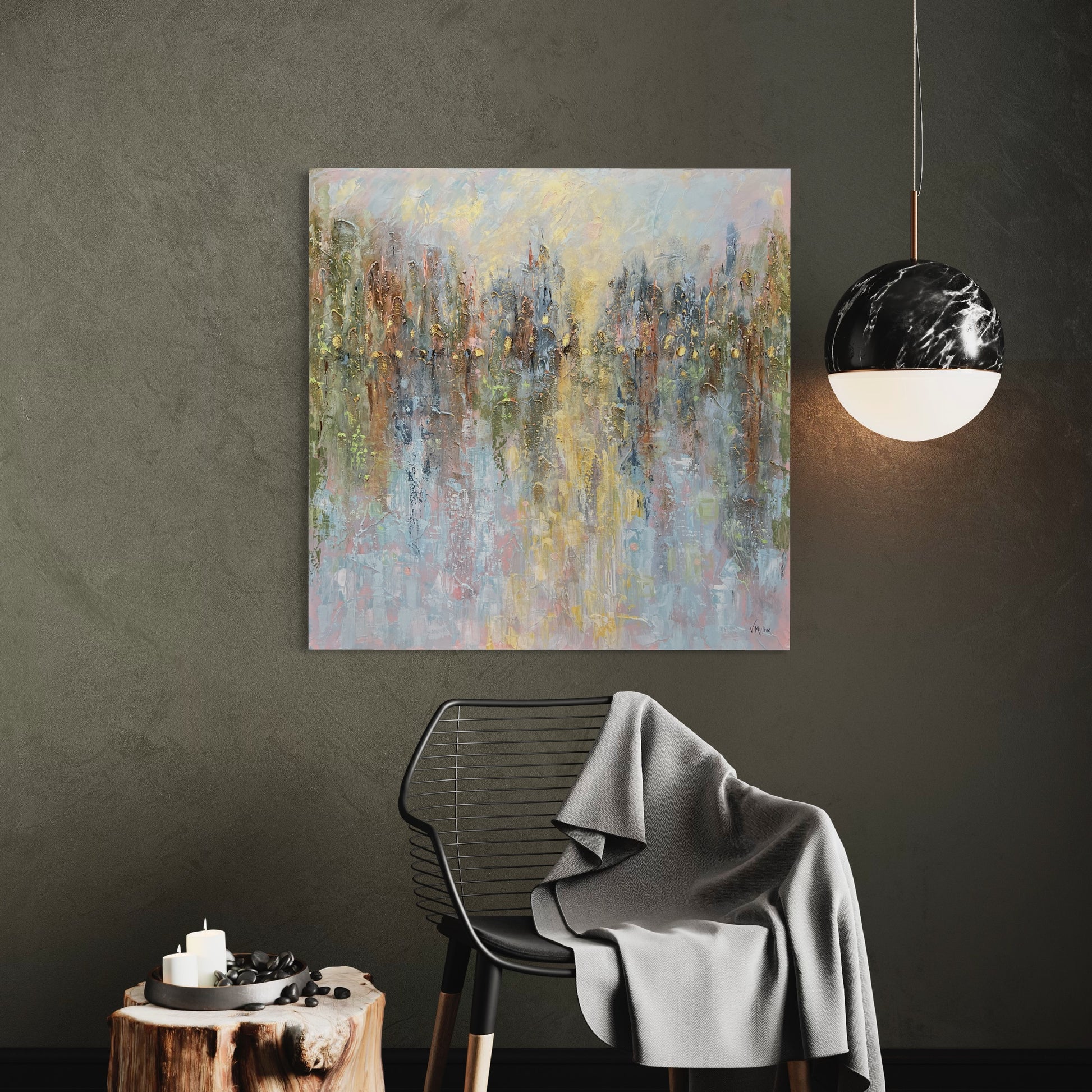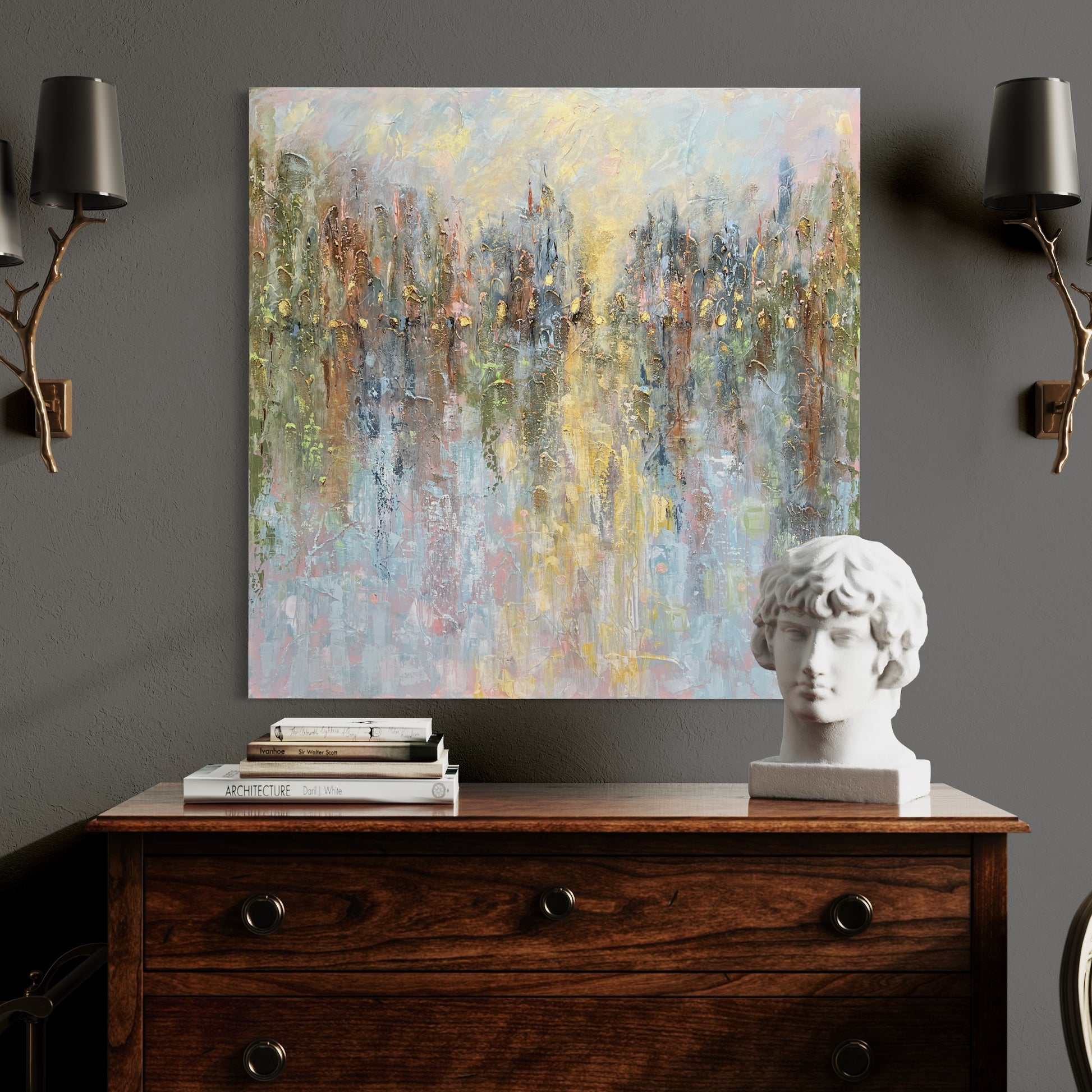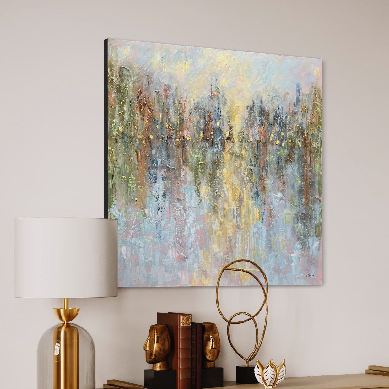 Walk into a dreamlike place with this captivating abstract landscape painting. Its ethereal reflective landscape, adorned with soft, neutral shades of gold, blue, green, navy, bronze, and white, is certain to evoke a feeling of serenity and tranquility.