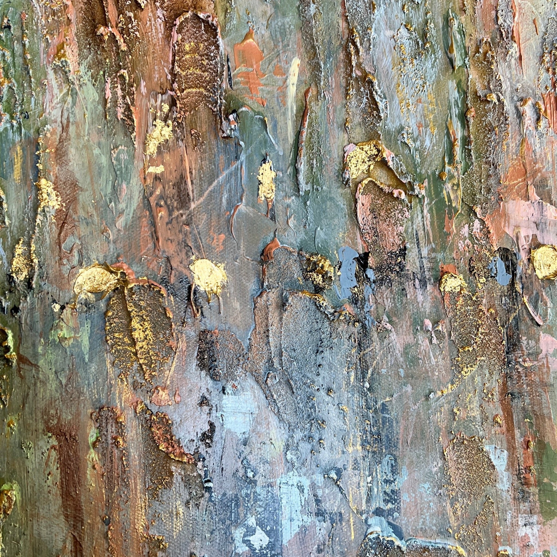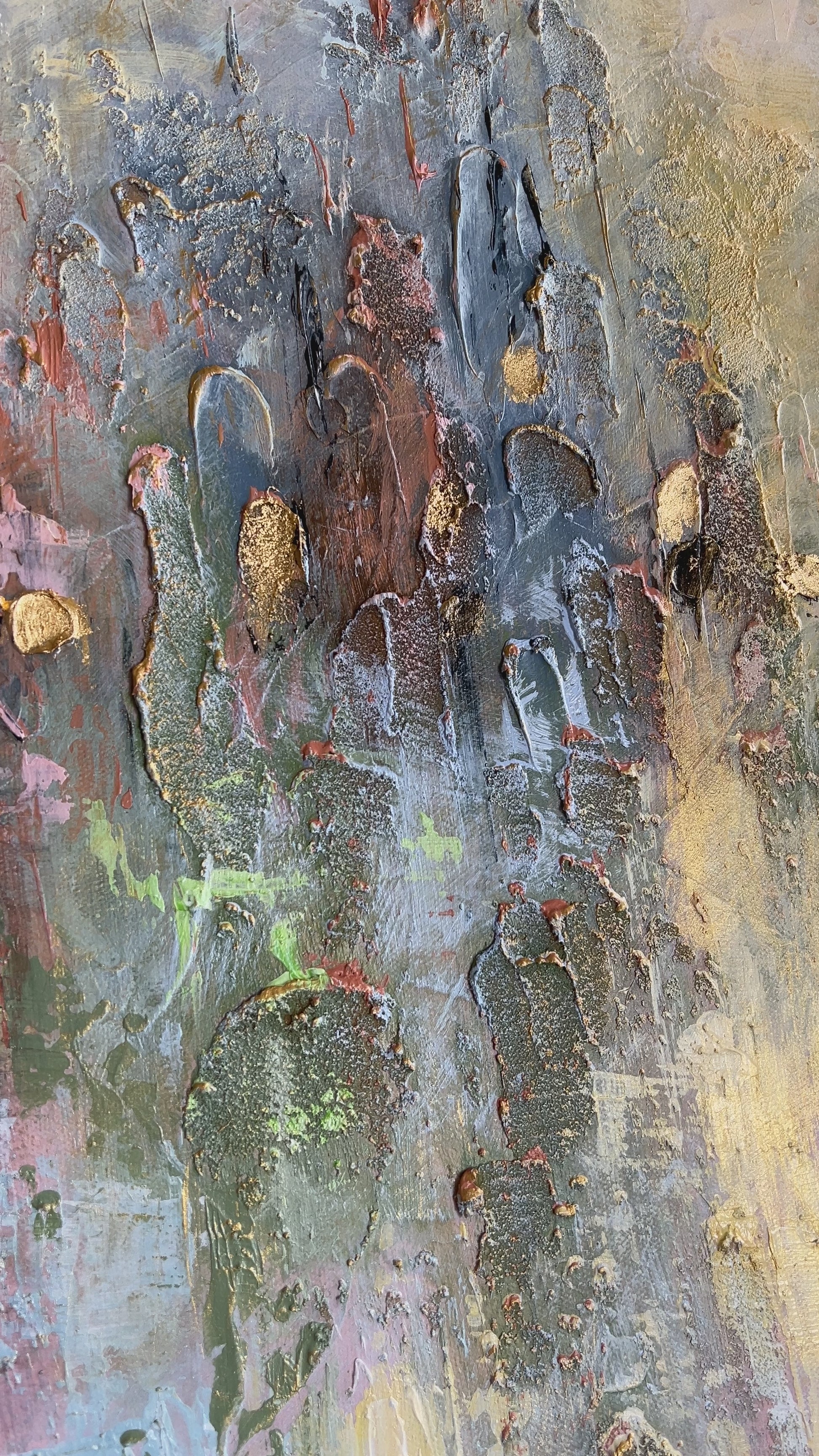 The thick texture, achieved through a combination of brushstrokes and palette knife techniques combining sand and paint, creates an immersive and tactile experience. The shimmering 24 K gold leaf and iridescent paint touches add a touch of glamour to the artwork.
