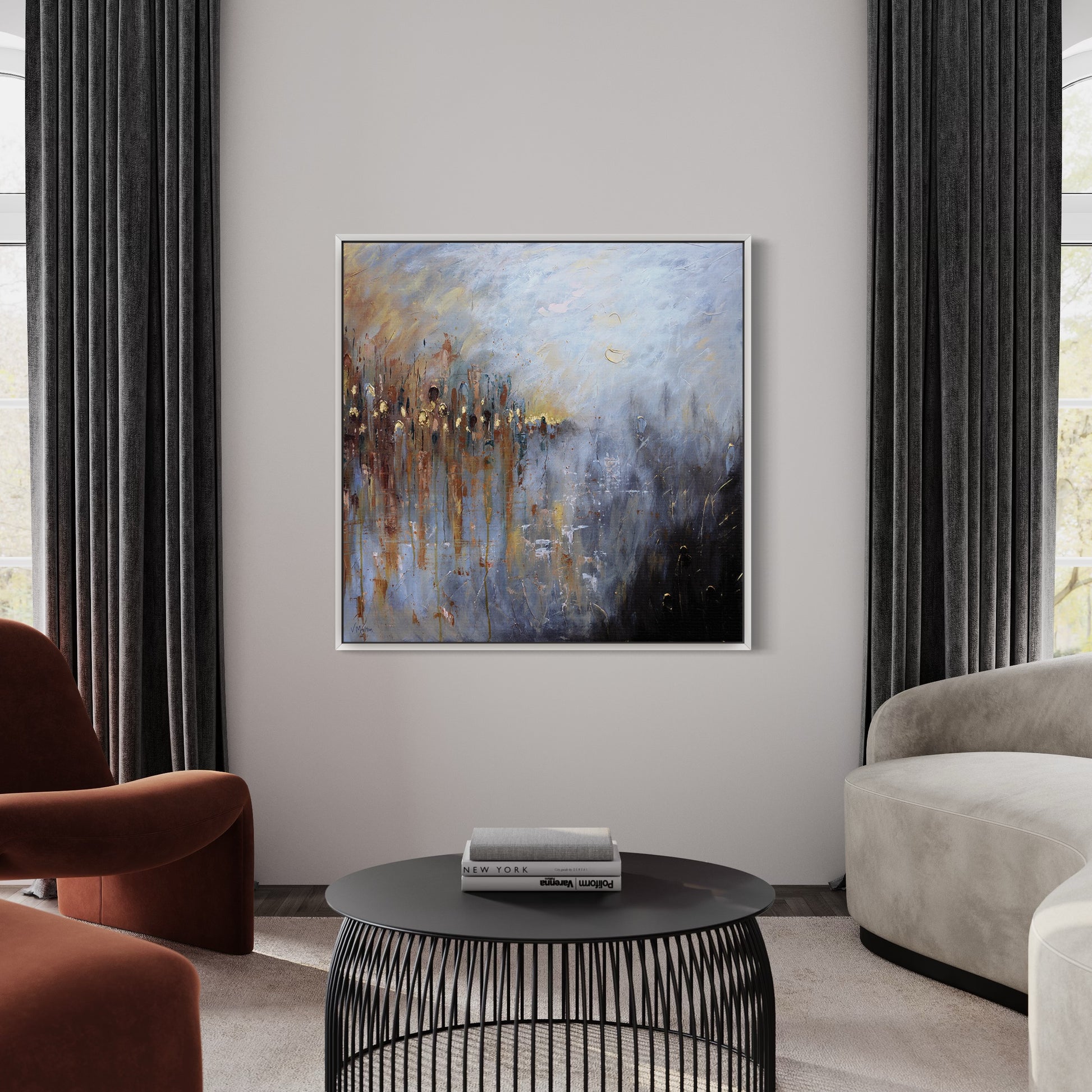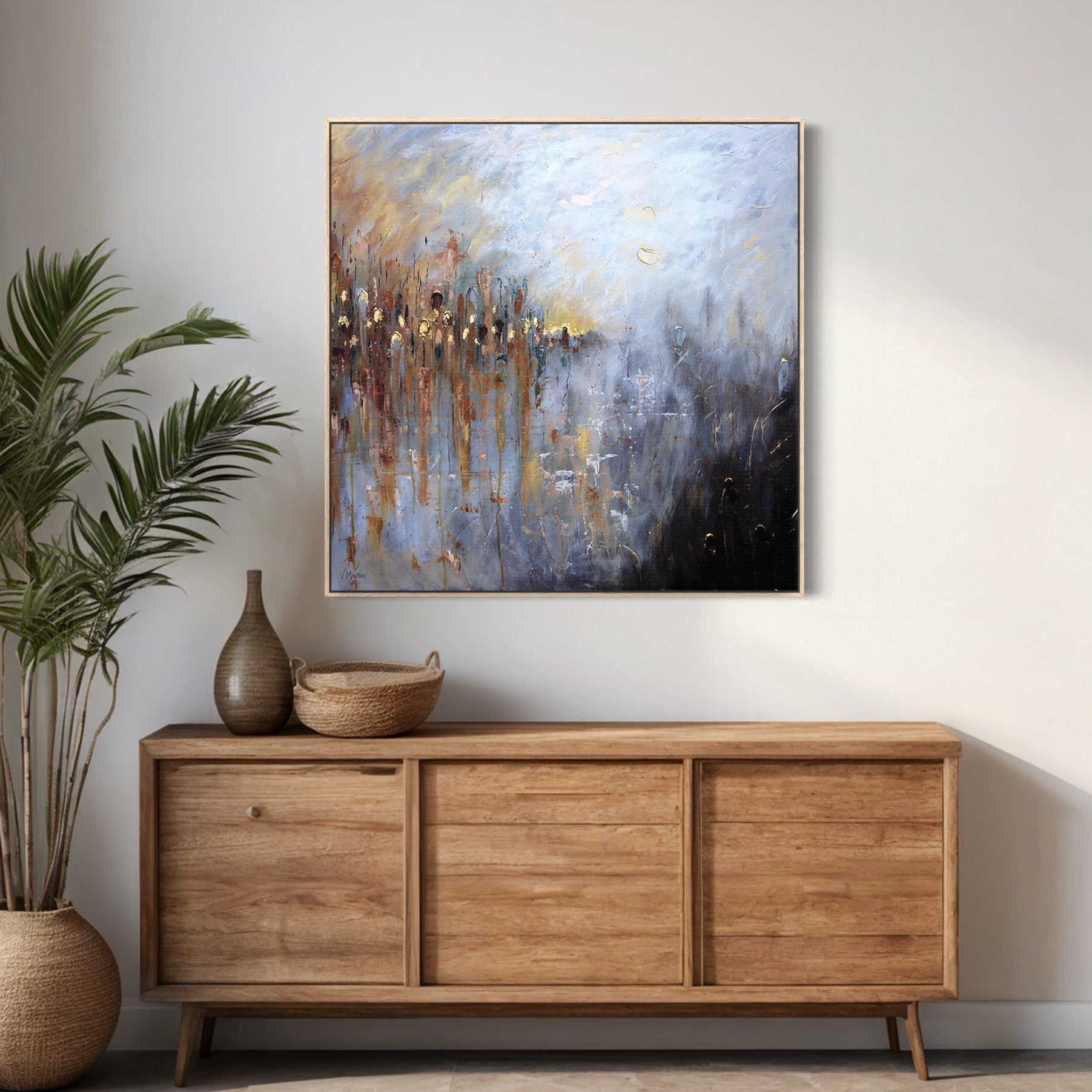 Add drama and intrigue with “Suspended on the Horizon,” a bold abstract giclée canvas print. Deep strokes of black and brown mingle with gold, bronze, and muted gray, evoking the shifting balance between day and night in a powerful, atmospheric composition.