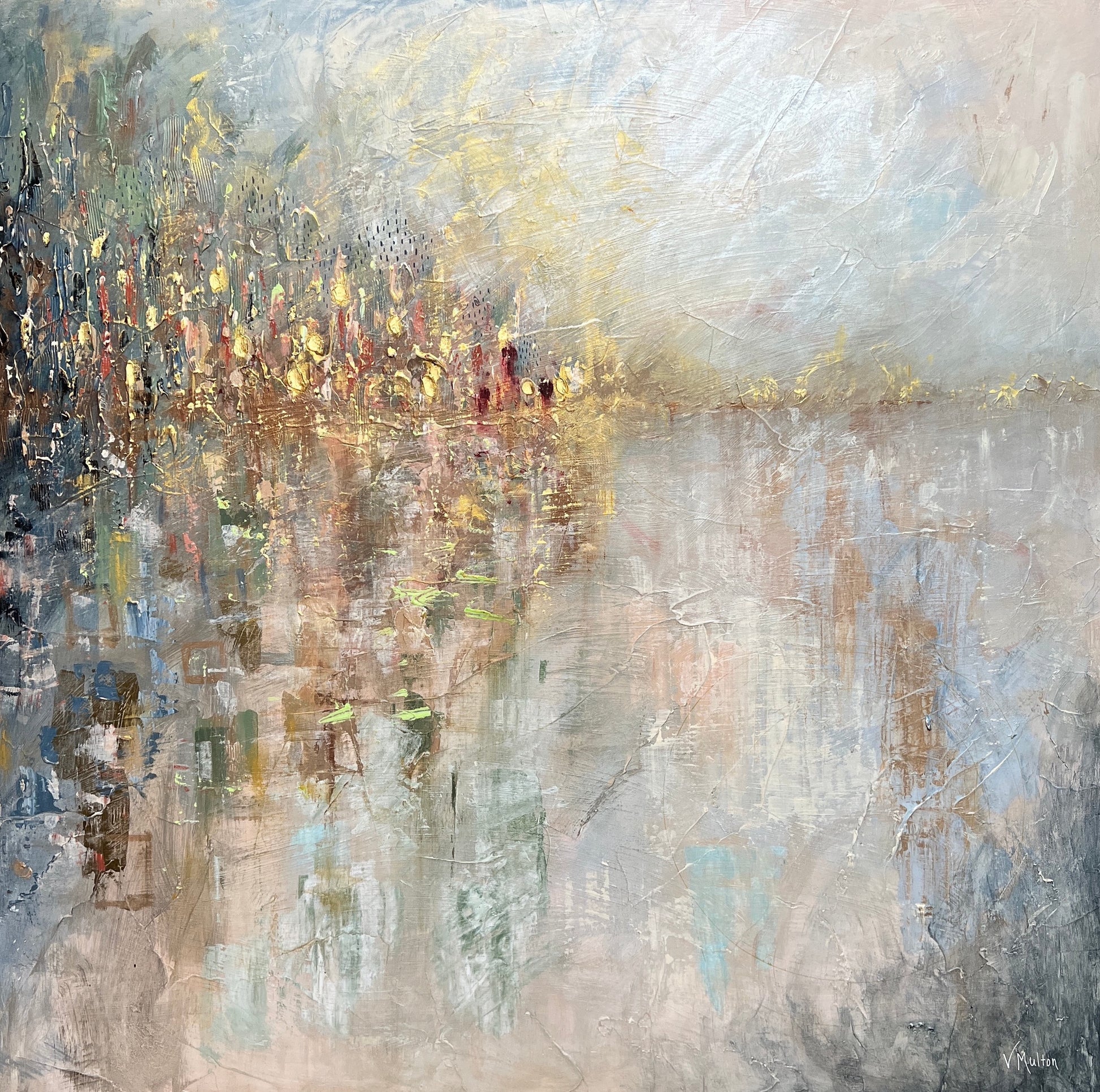 Imagine traversing Tennessee's landscapes and discovering a spot where you're compelled to pause and linger. Within this artwork, immerse yourself in that sensation as delicate strokes of 24 K gold leaf and iridescent paint evoke a captivating gleam, infusing an essence of sophistication and charm.