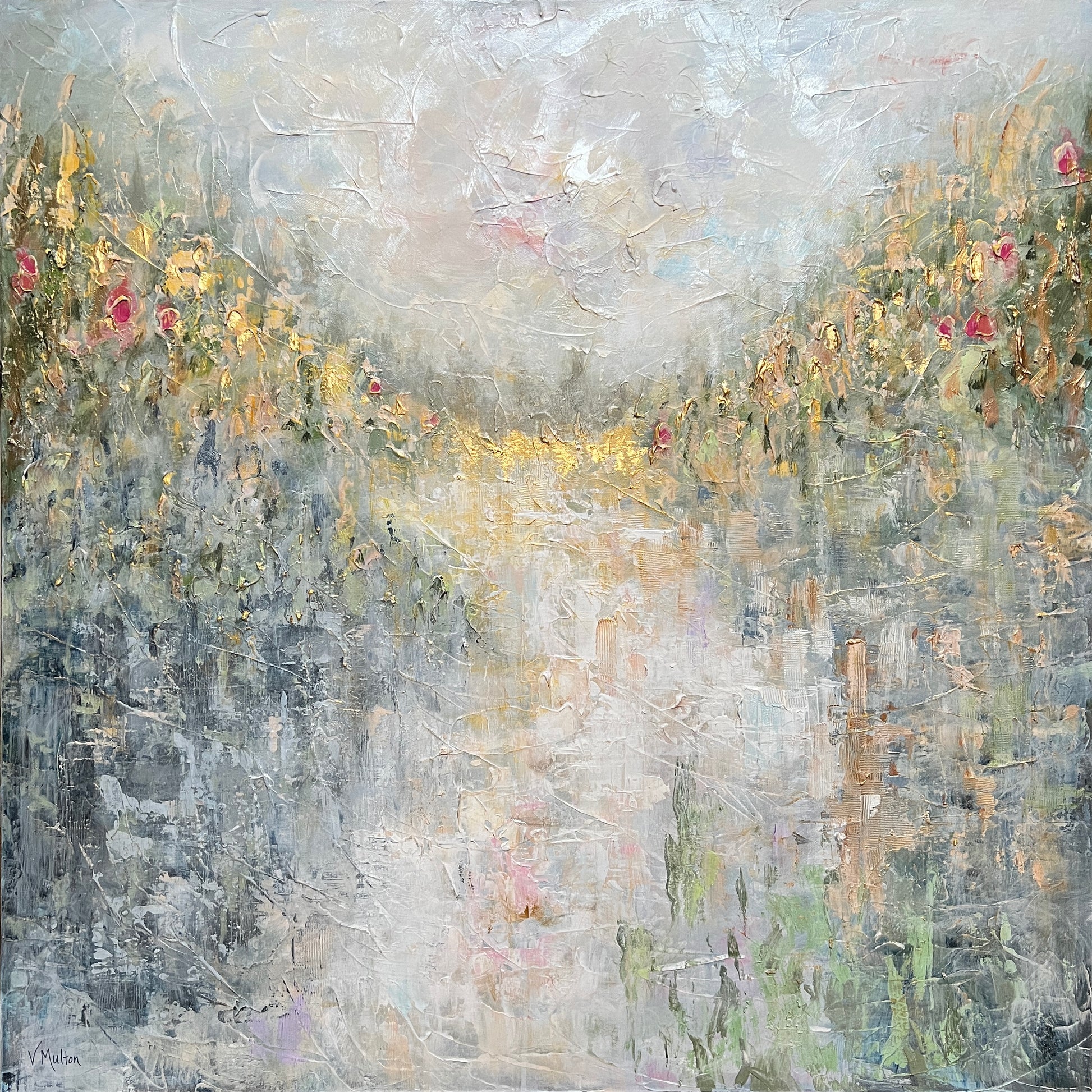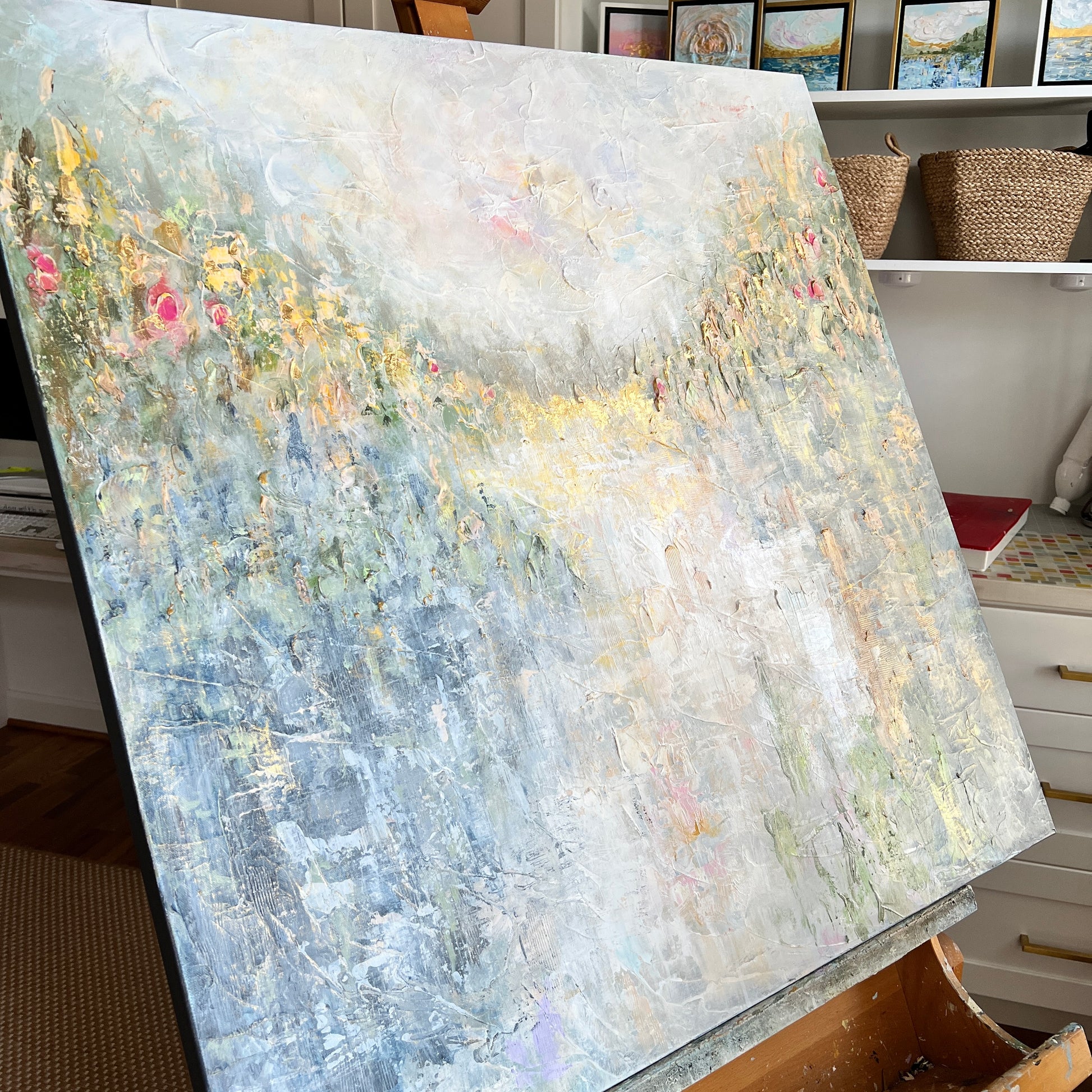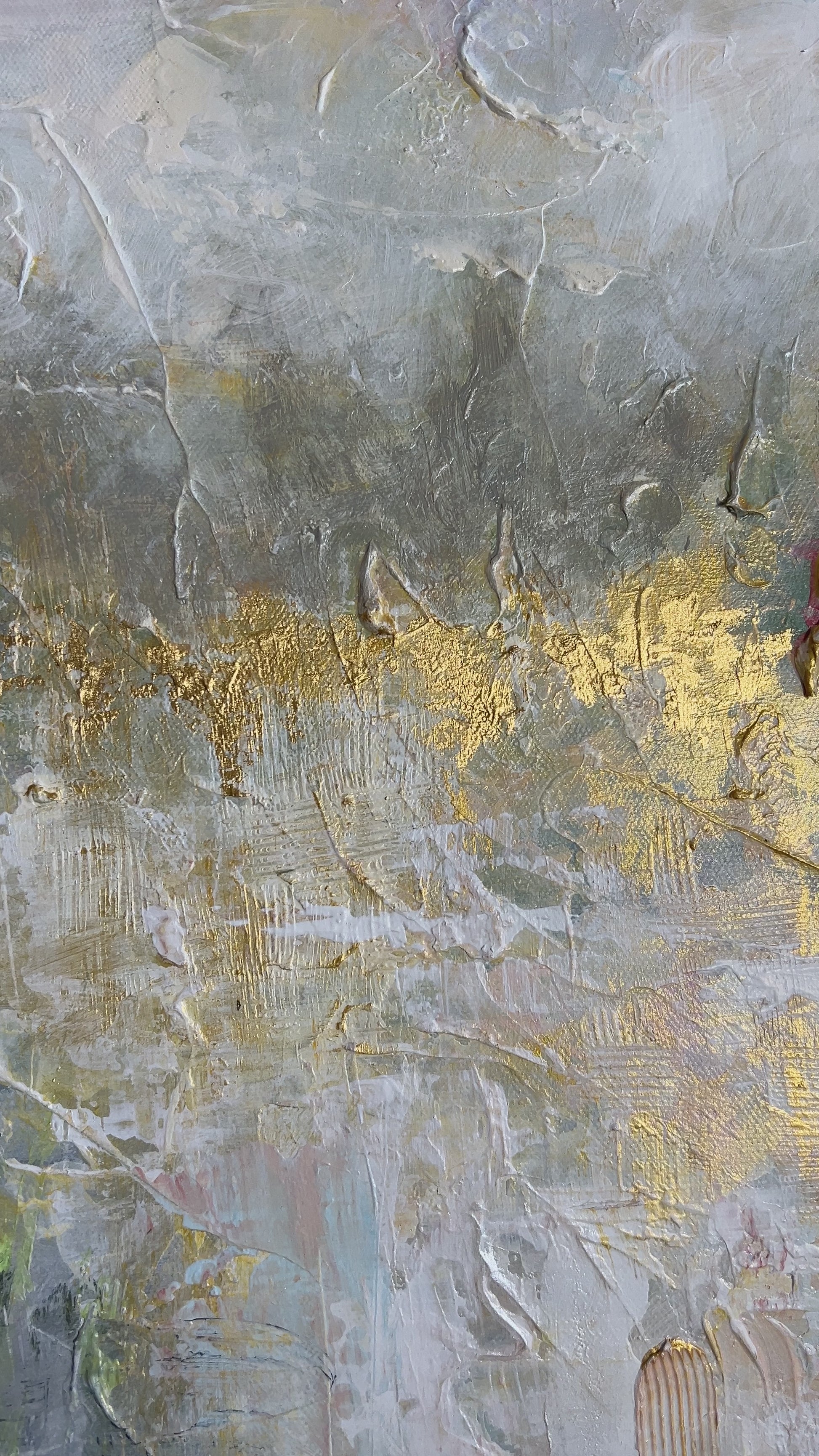 Immerse yourself in the luxurious textures crafted by thick paint, skillfully applied with a blend of brushstrokes and palette knife techniques. Marvel at the enchanting shimmer brought to life by delicate touches of 24 K gold leaf and iridescent paint, adding an element of elegance and allure.