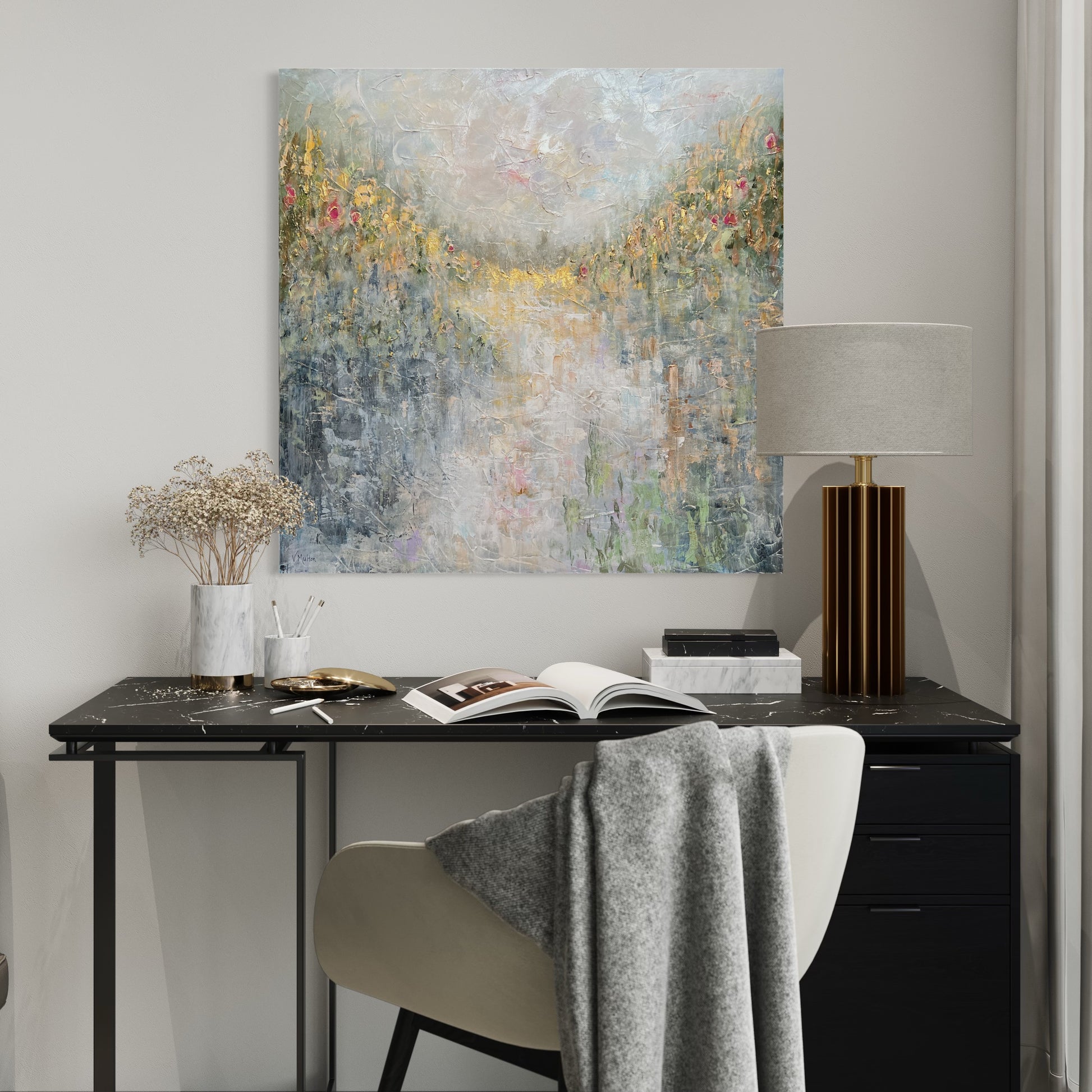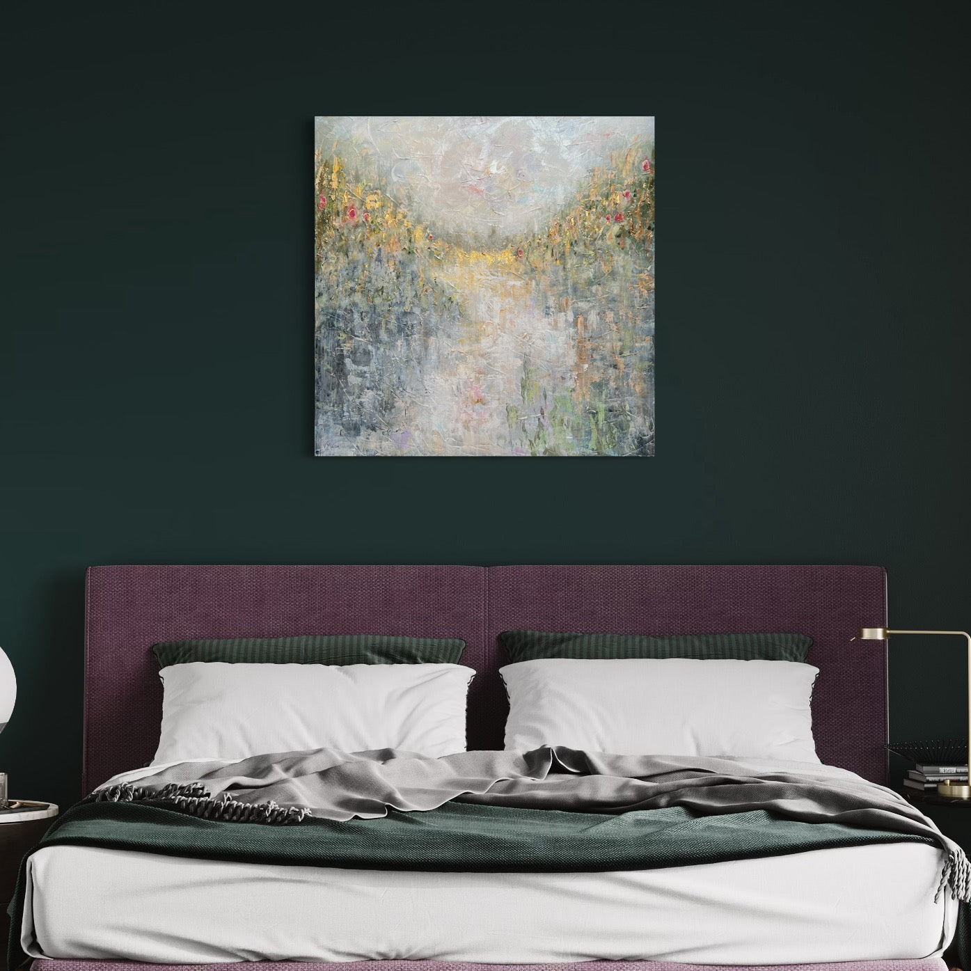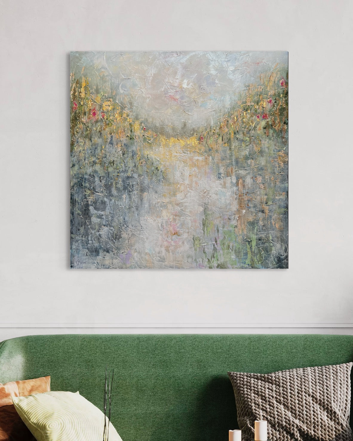 Enter a peaceful realm with this captivating abstract landscape painting, unveiling an ethereal and reflective natural vista. The serene blend of pink, green, blue, gold, and white hues creates a harmonious atmosphere, perfect for transforming any space.